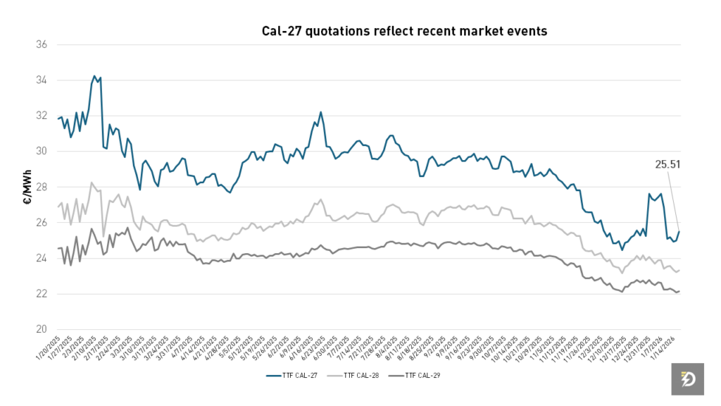 Las previsiones apuntan a que la presión actual no es estructural, sino coyuntural. A medida que entren estaciones más cálidas, el consumo de gas tenderá a moderarse y eso debería aliviar parte de la tensión. Además, la llegada de grandes proyectos de GNL a partir de la segunda mitad de 2026 contribuiría a recuperar estabilidad. Esto se ve reflejado en las cotizaciones de los productos Calendar donde la volatilidad cortoplacista afecta principalmente a Cal-27, lo que muestra signos de un incremento puramente especulativo más que fundamental. Cal-28 y Cal-29 prosiguen su estabilización en por debajo de 25 €/MWh.