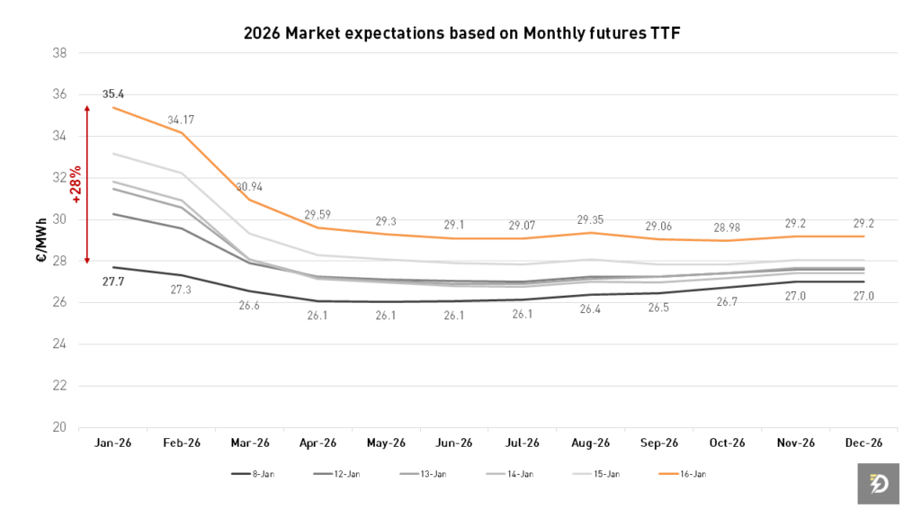 Fuente: EEX – Expectativas del mercado para 2026 basadas en los futuros mensuales del TTF