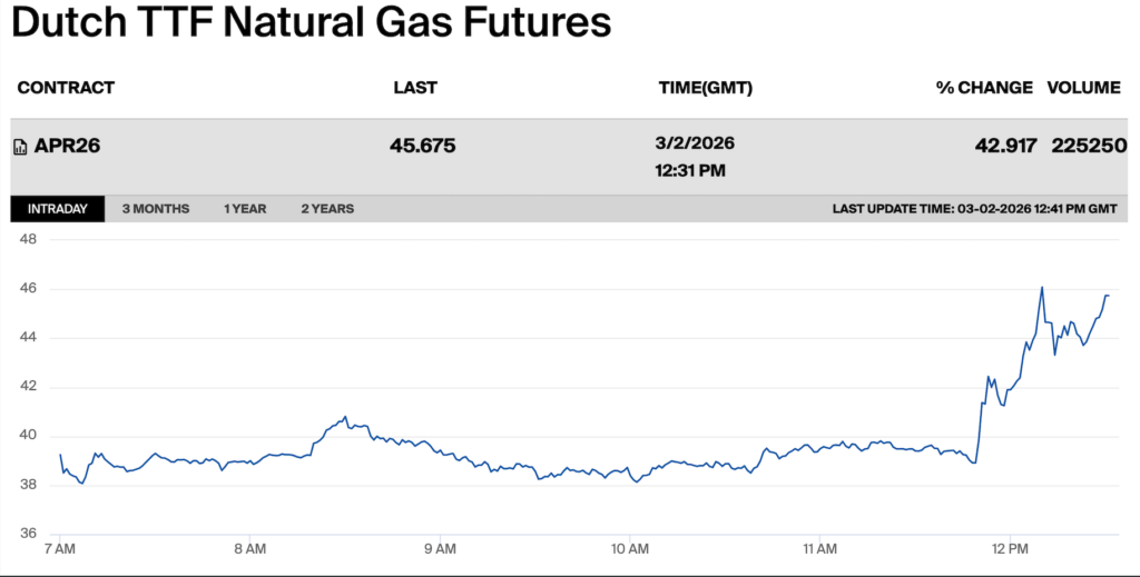 La reacción no se ha quedado en titulares. En ICE Endex, los futuros del Dutch TTF mostraron un salto abrupto. El contrato APR26 marcaba 46,70€/MWh, con una subida del 46.12% y un volumen de 248.985. En intradía llegó a superar los 40 €/MWh antes de retroceder.
